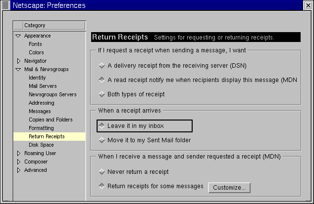 Per specificare le preferenze per le ricevute di ritorno, andate su Edit => Preferences => Mail & Newsgroups => Return Receipts. Nella finestra che si aprirà (si veda la Figura 7-17), scegliete come volete utilizzare le ricevute di ritorno per la posta che spedite e che ricevete.