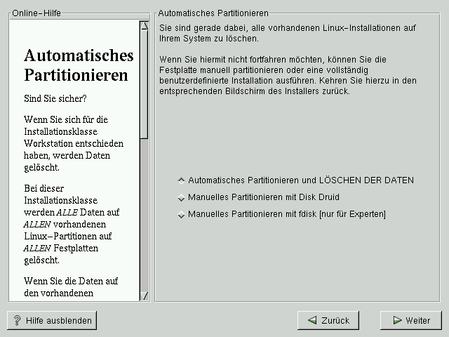 Bei einer Workstation-Installation werden alle Daten in allen vorhandenen Linux-Partitionen gelöscht.