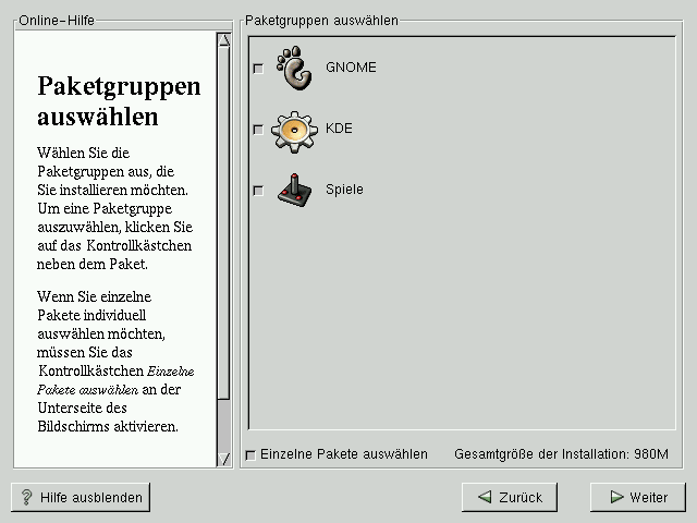 Auch wenn bei einer Workstation-Installation die meisten Pakete automatisch für Sie ausgewählt werden, müssen Sie festlegen, ob Sie entweder GNOME oder KDE (oder beide Benutzeroberflächen) verwenden möchten. Sie können auch entscheiden, ob Sie das Paket Spiele installieren möchten.