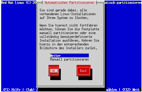 Wenn Sie Ihr System lieber selbst partitionieren möchten, wählen Sie die Optionen Manuelles Partitionieren mit Disk Druid oder Manuelles Partitionieren mit fdisk.
