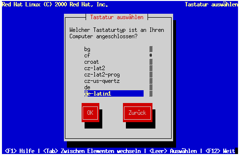 Wählen Sie mit den Pfeiltasten den geeigneten Tastaturtyp aus, der sowohl während der Installation als auch als Standardeinstellung Ihres Systems verwendet werden soll, und drücken Sie die Eingabetaste.