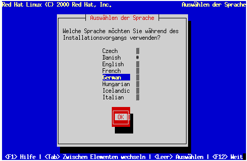 Wählen Sie mit den Pfeiltasten die geeignete Sprache aus, die sowohl für die Installation als auch als Standardeinstellung Ihres Systems verwendet werden soll. Drücken Sie dann die Eingabetaste.