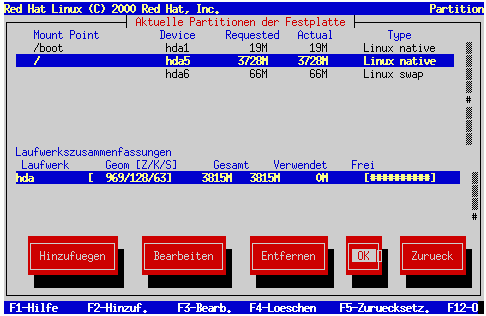 Disk Druid ist das Partitionierungstool, das in Red Hat Linux 7.0 verwendet wird. Die Funktionen von Disk Druid sind für eine typische Red Hat Linux Installation völlig ausreichend - nur ganz außergewöhnliche Konfigurationen können mit diesem Tool nicht gemeistert werden.
