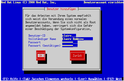 Als Nächstes müssen Sie einen Benutzeraccount für das tägliche Arbeiten mit dem System erstellen. Mit einem Benutzeraccount können Sie sich einfach und problemlos an Ihrem Computer anmelden, ohne hierfür Ihren Root-Account heranziehen zu müssen. Das von Ihnen eingegebene Passwort muss mindestens sechs Zeichen umfassen und wird nicht auf dem Bildschirm ausgegeben. Geben Sie das Passwort zweimal ein. Wenn die beiden Passwörter nicht übereinstimmen, fordert Sie das Installationsprogramm dazu auf, die Passwörter nochmals einzugeben.