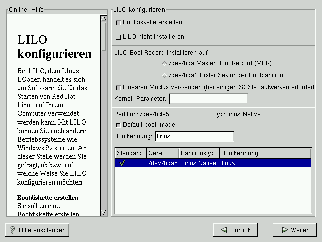 Normalerweise müssen Sie LILO (den LInux LOader) installieren, um Ihr Red Hat Linux System booten zu können. Sie können LILO an einem von zwei Orten installieren: