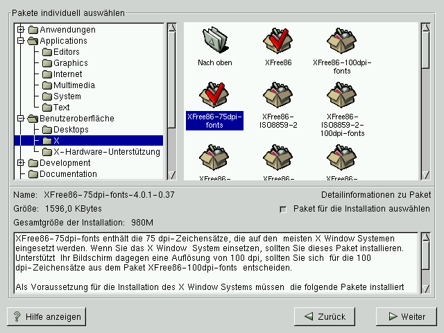 Auf der linken Bildschirmseite wird eine Verzeichnisliste der verschiedenen Paketgruppen angezeigt. Wenn Sie die Liste erweitern (doppelklicken Sie auf die Liste, um sie zu markieren) und auf ein einzelnes Verzeichnis doppelklicken, wird die Liste der zur Installation verfügbaren Pakete auf der rechten Seite angezeigt.