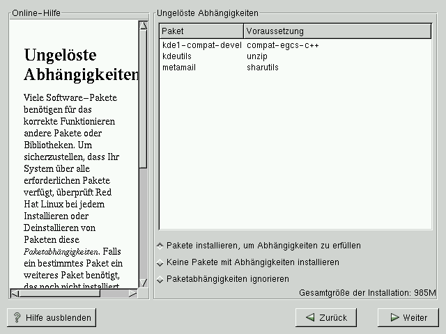 Falls Pakete fehlen, die andere Pakete zur korrekten Ausführung benötigen, zeigt das Programm eine Liste dieser ungelösten Abhängigkeiten an und gibt Ihnen die Möglichkeit, sie zu lösen (siehe Abbildung A-4).