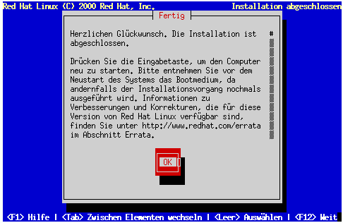 Um Ihr gerade installiertes Red Hat Linux System neu zu booten, drücken Sie die Eingabetaste.