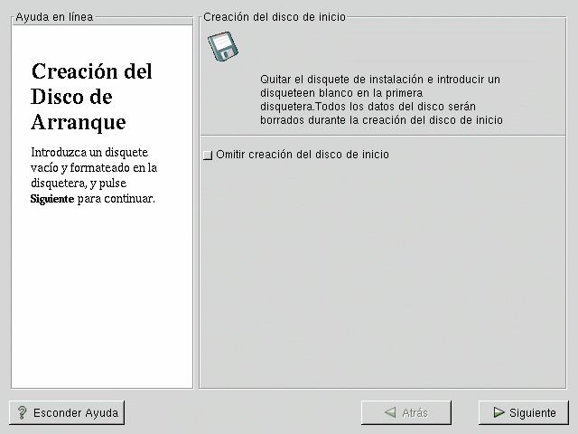 Tras un momento, su disco de arranque será creado; saquélo de la disquetera y etiquételo apropiadamente. Fíjese que si desea crear un disco de arranque tras la instalación, podrá realizarlo. Para más información, dispone de la hoja de manual ("man page") de mkbootdisk, tecleando man mkbootdisk en el promt de la shell.