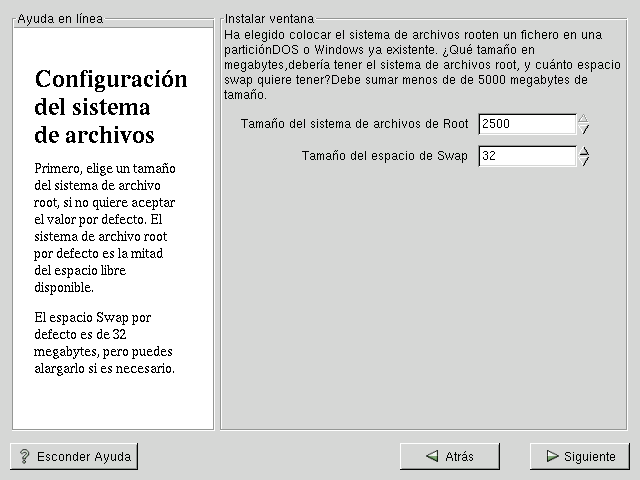 El tamaño que ha asignado para el sistema de ficheros root es la cantidad de espacio del disco disponible para todo el sistema de ficheros (esto significa que deberá tener en cuenta el tamaño del tipo de instalación que va a realizar, tal que le permita disponer de espacio para escribir y grabar datos).