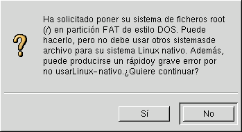 Aparecerá una casilla de verificación (vea Figura B-3) pidiéndole que confirme si desea continuar con la instalación. También explica que usted no podrá tener ninguna partición Linux en su sistema, no habrá otra más que la partición DOS etiquetada / que acaba de crear. Haga click en Yes para continuar.