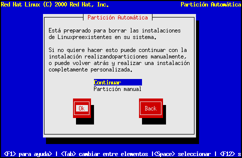 Si no apareciera la pantalla de Particionamiento Automático, será porque no tiene suficiente espacio libre en disco para realizar esta instalación. Podrá reiniciar el sistema y probar a localizar más espacio en disco, o bien elegir particionamiento manual. |