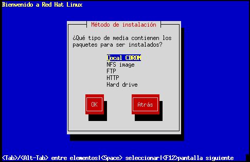 Si arranca directamente desde el CD-ROM de instalación de Red Hat Linux, verá el diálogo de Bienvenida: diríjase a la sección de nombre Bienvenido a Red Hat Linux.