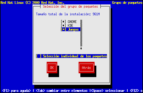 Para ver la lista de paquetes, use las teclas de cursor para seleccionar el grupo y pulse Enter o Space. Cuando una lista es seleccionada, el signo + (cerrado) cambia al signo - (abierto) y una lista de paquetes de esa categoría aparecerá en pantalla. Un carácter * al lado de los paquetes seleccionados. Pulse Enter o Space para seleccionar o deseleccionar paquetes.
