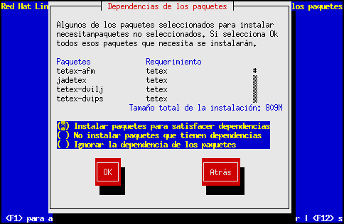 Si algunos paquetes requieren otros paquetes que no han sido seleccionados, el programa presenta una lista de las dependencias no resueltas y le proporciona la oportunidad de remediarlo. Simplemente presionando OK, el programa añadirá automáticamente todos los paquetes requeridos a la lista de paquetes seleccionados.