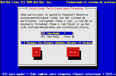 Cuando haya seleccionado las particiones a formatear, presione Space. Si desea comprobar la existencia de bloques dañados mientras formatea cada sistema de ficheros (recomendado si tiene unidades de disco antiguas), seleccione comprobar bloques dañados durante se formatea. Seleccione OK, y pulse Space.