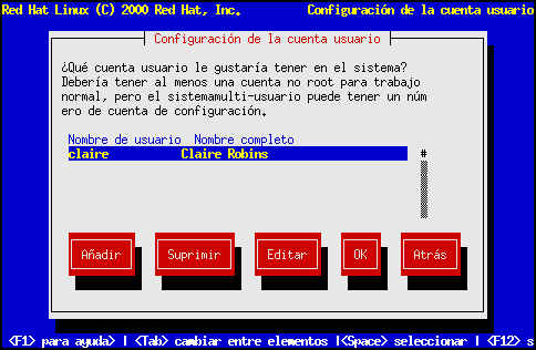 Cree una cuenta de usuario para usted mismo, la cual pueda usar habitualmente. Una cuenta de usuario le permitirá entrar en su sistema fácilmente y de modo seguro, sin necesidad de tener que ser root. La clave que introduzca debe tener al menos seis caracteres de longitud y no será mostrada en pantalla. Introduzca la clave dos veces; si las dos claves no coinciden, el programa de instalación le sugerirá introducirlas de nuevo.