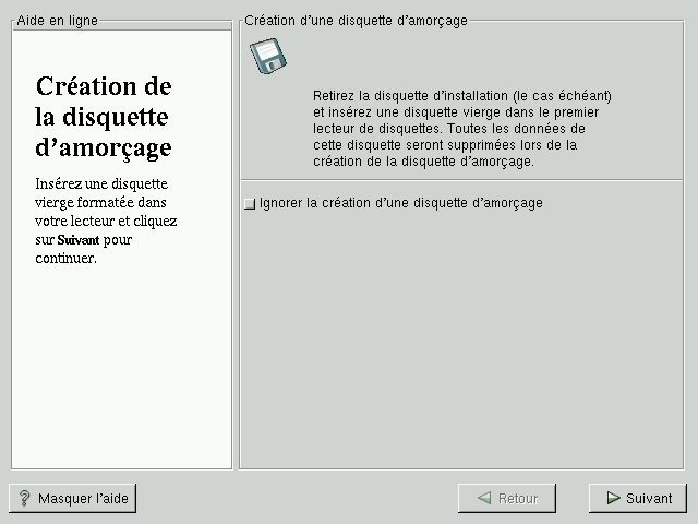 Après quelques instants, la disquette d'amorçage sera créée ; retirez-la du lecteur et étiquetez-la clairement. Notez que vous pourrez également créer une disquette d'amorçage après l'installation. Pour plus d'informations, reportez-vous à la page de manuel mkbootdisk en entrant man mkbootdisk à l'invite du shell.