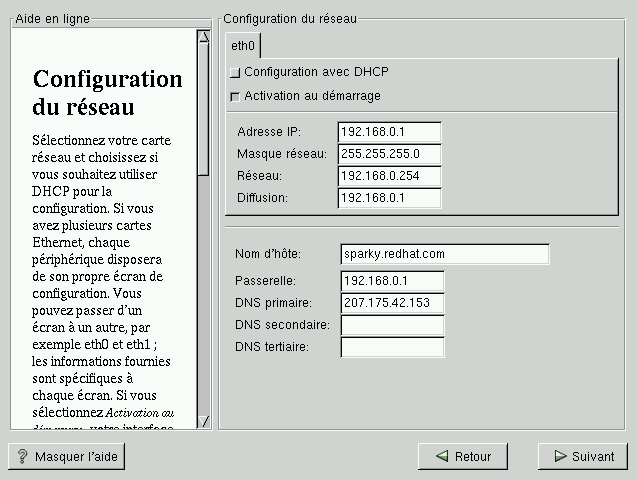 Sélectionnez le type de périphérique approprié et indiquez si vous souhaitez utiliser le protocole DHCP (Dynamic Host Configuration Protocol) pour la configuration. Si vous disposez de plusieurs périphériques Ethernet, chacun conservera les informations fournies. Vous pouvez basculer d'un périphérique à l'autre, par exemple entre eth0 et eth1 ; les informations fournies sont propres à chacun d'eux. Si vous sélectionnez Activation au démarrage, votre interface réseau sera lancée au démarrage. Si vous ne disposez pas d'un accès client DHCP ou n'êtes pas sûr de la configuration à adopter, contactez votre administrateur réseau.