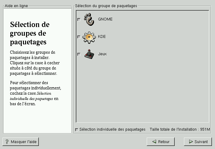 Bien que le programme sélectionne automatiquement la plupart des paquetages lors d'une installation de type poste de travail, il vous appartient de choisir GNOME ou KDE (ou les deux). Vous pouvez également décider d'installer le paquetage Jeux.