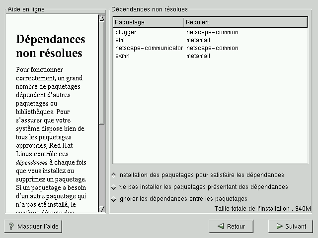 Sous la liste des paquetages manquants, au bas de l'écran, figure une case à cocher Installation des paquetages pour satisfaire les dépendances activée par défaut. Si vous la laissez activée, le programme d'installation résout automatiquement les dépendances du paquetage en ajoutant tous les paquetages nécessaires à la liste des paquetages sélectionnés.