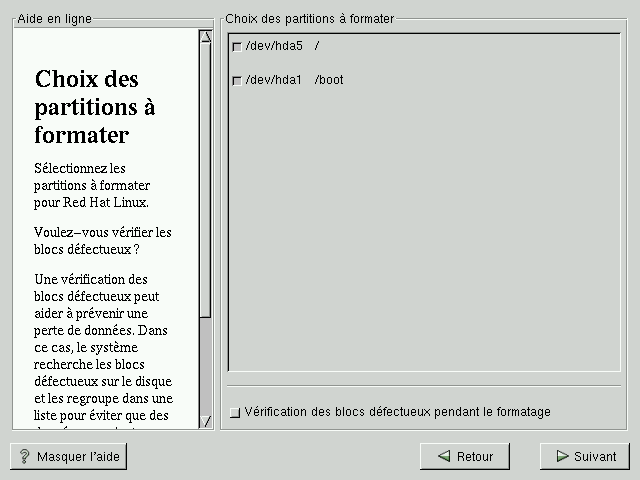 Cette recherche des blocs défectueux peut allonger sensiblement la durée totale de l'installation. En effet, étant donné la taille importante de la plupart des disques durs actuels, la détection des éventuels blocs défectueux peut prendre un certain temps. |