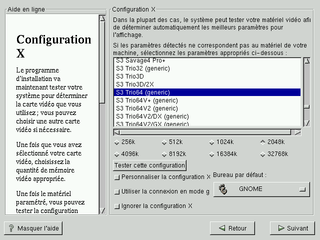 Indiquez ensuite la quantité de mémoire vidéo de votre carte. Si vous hésitez sur la réponse à fournir, reportez-vous à la documentation fournie avec la carte. Vous ne risquez pas d'endommager votre carte vidéo si vous sélectionnez une mémoire plus importante que celle réellement disponible ; en revanche, le serveur X ne pourra peut-être pas démarrer correctement.
