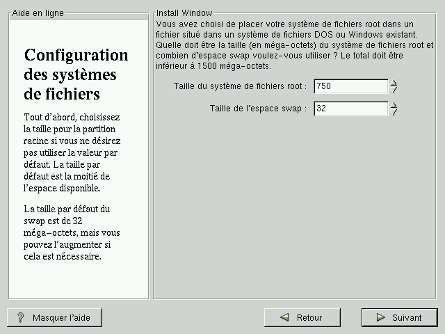 Ensuite, vous avez la possibilité de déterminer la taille du système de fichiers root (/) et la taille de la partion de swap nécéssaire.