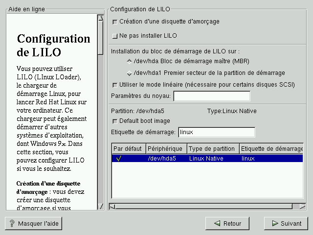 Emplacement recommandé pour installer LILO, à moins que le bloc de démarrage maître ne démarre déjà un autre chargeur de système d'exploitation tel que System Commander ou le gestionnaire de démarrage d'OS/2 . Le bloc de démarrage maître (MBR) est une zone spéciale de votre disque dur, automatiquement chargée par le BIOS de votre ordinateur ; c'est le premier point à partir duquel LILO peut prendre le contrôle du processus de démarrage. Si vous installez LILO dans le bloc de démarrage maître, lors du démarrage de l'ordinateur, LILO affiche une invite boot:. Vous pouvez ensuite démarrer Red Hat Linux ou tout autre système d'exploitation pour le démarrage duquel vous configurez LILO.
