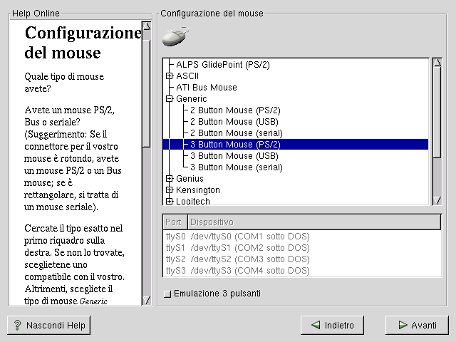 Se avete un mouse PS/2 o un Bus Mouse, non dovete selezionare un dispositivo. Se avete un mouse seriale, dovrete scegliere la porta alla quale è collegato.
