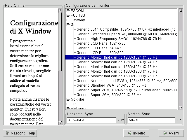 Se il vostro monitor non appare nella lista, selezionate il modello Generic più simile al vostro monitor. Se selezionate un monitor Generic, Xconfigurator richiederà l'inserimento di un range di frequenze orizzontale e verticale. I valori da inserire sono reperibili nelle specifiche tecniche del monitor. Consultate la documentazione relativa al monitor per assicurarvi di aver inserito i valori corretti.