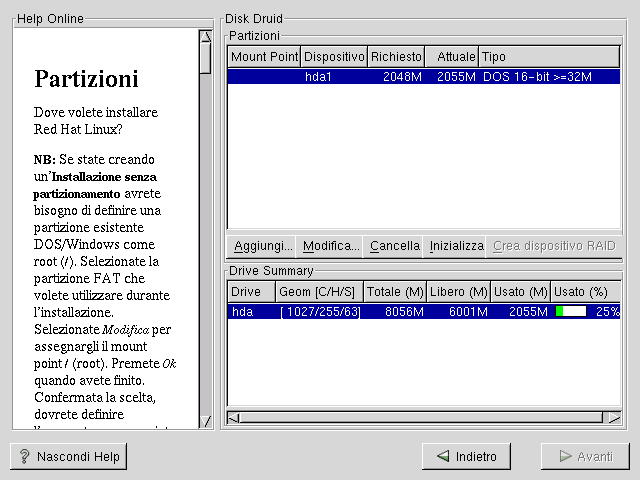 Visto che non aggiungerete partizioni o creerete partizioni nuove, ci sono poche cose che avete bisogno di fare con Disk Druid (è un tool grafico per il partizionamento del disco).