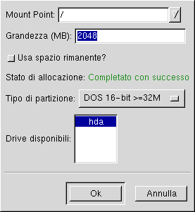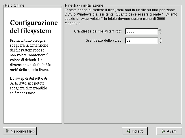 Lo spazio di swap aumenta la memoria RAM disponibile tramite il meccanismo della memoria virtuale. In altre parole, i dati vengono scritti su una partizione swap se non c'è abbastanza RAM per immagazzinare i dati che il vostro sistema sta elaborando. Il programma d'installazione inserisce uno swap di 32MB. Potete scegliere di aumentare la dimensione dello swap, ma normalmente non c'è bisogno di creare uno spazio swap più grande di 256MB.