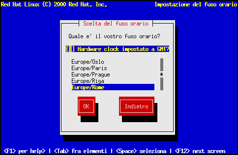 Se volete configurare l'orologio del sistema (CMOS) a GMT (Greenwich Mean Time, anche conosciuto come UTC, Universal Coordinated Time), selezionate Hardware clock set to GMT. Configurare l'orologio del vostro sistema con il fuso orario di Greenwich significa poter gestire correttamente l'ora legale.