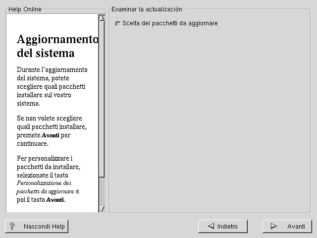 Se premete Avanti ed il pulsante Customizepackages to upgrade non è selezionato, il sistema inizierà automaticamente il processo di aggiornamento (vedasi la sezione Aggiornamento dei pacchetti).