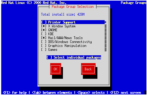 Beachten Sie, dass einige Pakete, die für jedes Red Hat Linux System benötigt werden (z.B. der Kernel und bestimmte Bibliotheken) in den Dialogfeldern für die Paketauswahl nicht erscheinen.