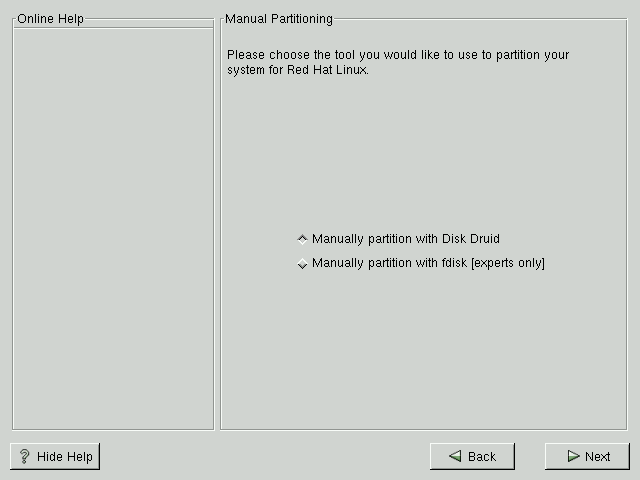 Manual Partitioning allows you to perform an installation while partitioning your drive(s) yourself. If you do not feel comfortable with partitioning your system, it is recommended that you do not choose to partition manually and instead choose Automatic Partitioning by clicking the Back and choosing to perform a workstation- or server-class installation.