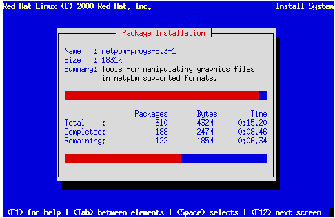 Figure 14-39 appears when the installation program is ready to format partitions and load software packages. The installation program names the log file (/tmp/install.log) for this Red Hat Linux installation. Select OK and press Space to continue.