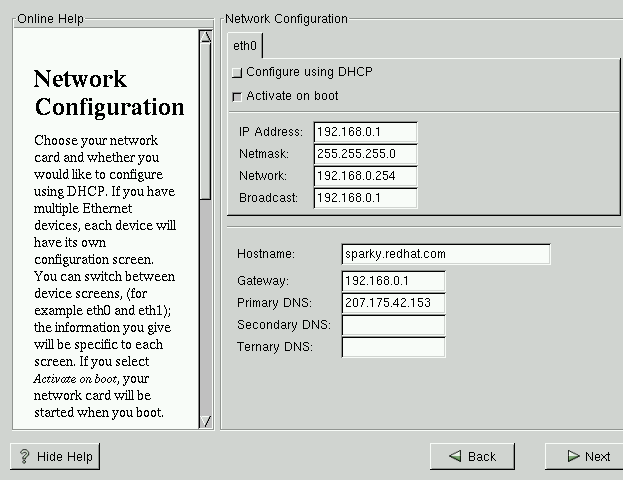 Elija el tipo de dispositivo y si quiere configurarlo utilizando el protocolo DHCP. Si tiene dispositivos múltiples ethernet ,cada uno de ellos mantendrá la información que usted configuró. Podrá pasar de un dispositivo a otro, por ejemplo eth0 y eth1, y las informaciones que proporcionará serán específicas para cada dispositivo. Si selecciona Activate on boot, su interfaz de red será iniciada durante el arranque del ordenador. Si no tiene acceso de tipo DHCP o no está seguro de cuál sea la información de red, contacte su administrador de red.