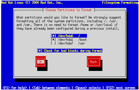 Cuando ha elegido las particiones para formatear, pulse Space. Si quiere efectuar un control para eventuales errores durante el formateo de cada sistema de ficheros, elija Check for bad blocks during format. Pulse OK, y Space.