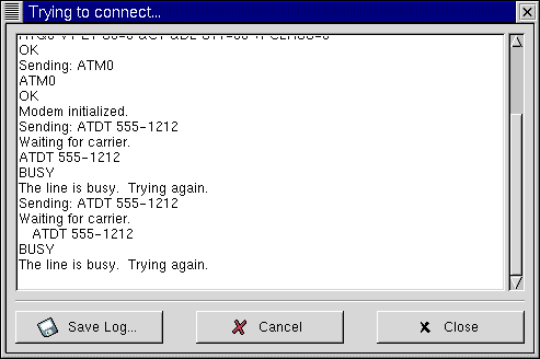 Sobald Sie auf diesen Button geklickt haben, wird ein ähnliches Fenster wie in Abbildung 6-14 angezeigt, in dem die gerade ausgeführten Befehle zum Initialisieren des Modems, Herstellen der Verbindung mit Ihrem ISP und Anmelden an Ihrem Internet-Account ausgegeben werden.