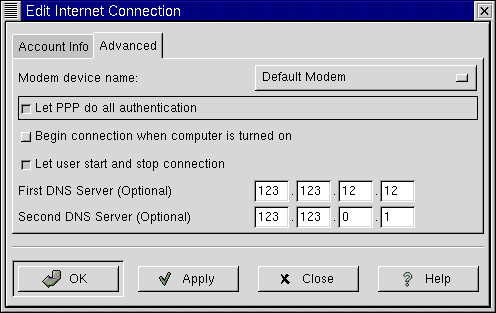 Note, also, that if you create an account in GNOME with RP3, but would rather use Kppp, you'll have to set up your account again in that application; in other words, information you enter in one application won't be available to the other application.