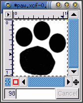 To make the image, create an oval selection, then use the bucket tool to fill in the selection with black. Copy the oval selection (Ctrl-C) and paste it (Ctrl-V) twice as you move the three ovals into an appropriate pattern. Then, use the paintbrush tool with a small brush to draw the pad of her foot. When you're drawing something, it is easier to draw a large image, then scale it after you're finished. The original black and white image, sized 128 x 134 pixels, looks like Figure 9-15.