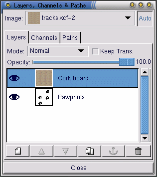 On the Layers dialog, make the pawprints layer the active layer by clicking on it. Then click on the eye icon ( ) to make the cork board layer invisible. (Another click on the eye icon's spot will make the layer visible again.)