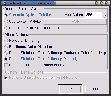 Antes de que GIMP le permita guardar una imagen como un .gif, necesitará convertir a colores indexed o a grayscale. Convierta a una imagen para colores indexed haciendo click de derecha en la imagen y después seleccionando Image => Mode => Indexed. El dialogo Indexed Color Conversion aparecerá: