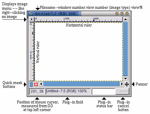 Cuando carga una imagen o la abre,GIMP rodea la imagen con un marco que incluye información útil e instrumentos, como se muestran en Figura 9-8.