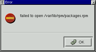 Si le aparece un mensaje de error parecido a "failed to open /var/lib/rpm/packages.rpm" (mire Figura 17-2) es probable que tenga un problema de permisos.
