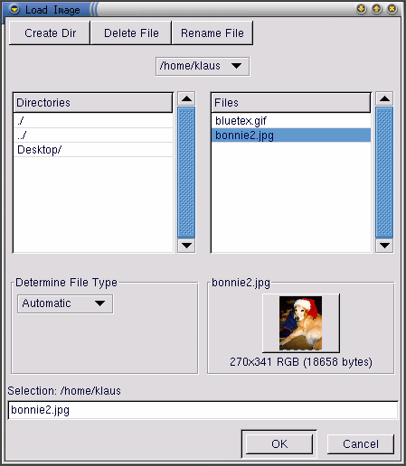 La fonction permettant de compléter le nom de fichier est prise en charge par GIMP. Si vous tapez la première lettre (ou plus) d'un nom de ficher dans le champ Selection, puis appuyez sur la touche Tab, l'affichage change, ne montrant que les sous-répertoires et/ou fichiers dont le nom commence par la (ou les) lettre(s) en question.