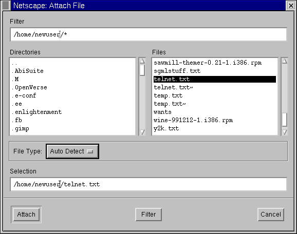 De la même manière que vous joignez des pages Web à votre lettre, vous pouvez y joindre des fichiers se trouvant sur votre ordinateur. Lorsque vous sélectionnez Attach dans la barre d'outils ou sous le champ de l'adresse, sélectionnez File dans le menu. La boîte de dialogue Attach File s'ouvre, révélant le contenu de votre répertoire de connexion (reportez-vous à la Figure 7-16).