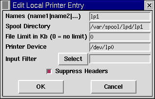 Nel campo Names, potete specificare un nome per la vostra coda di stampa (dove vengono inviati i lavori di stampa), e la directory di default alla quale volete che vengano mandate le vostre stampe (entry dello Spool Directory). Probabilmente potete lasciare inalterate queste configurazioni; notate che chiamando lp la rende una default printer.